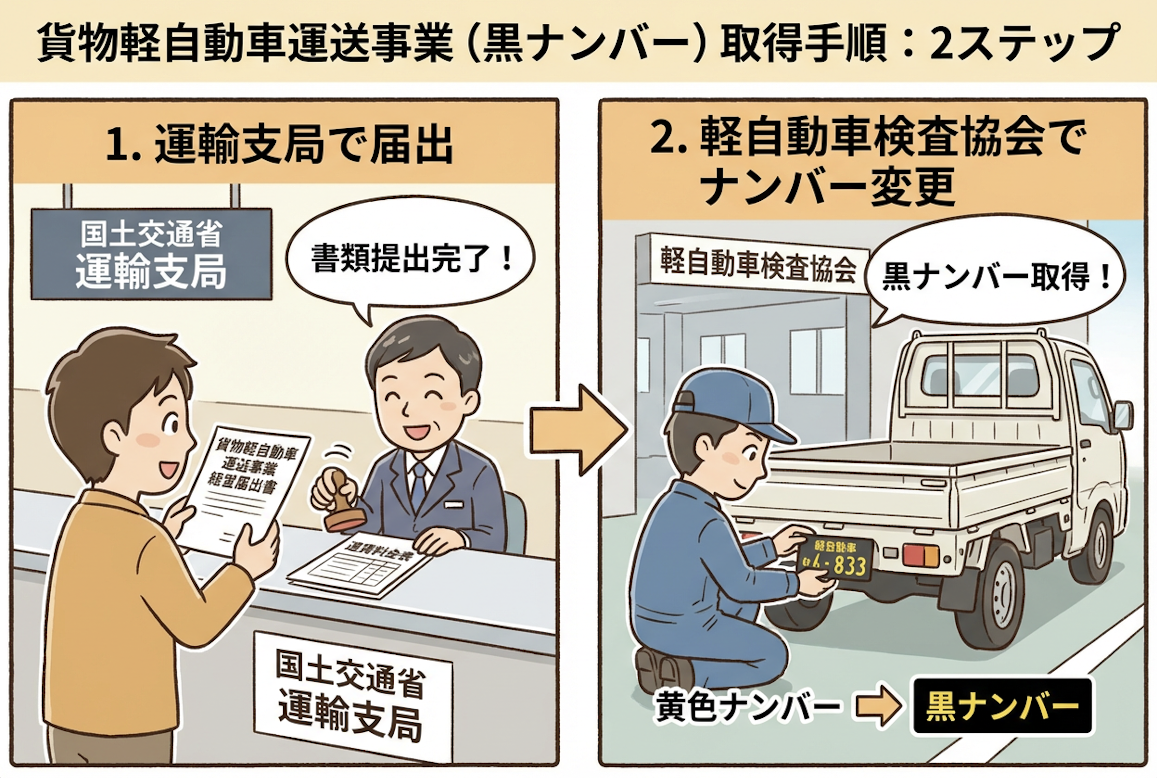- 手順は運輸支局で届出を行い、その後軽自動車検査協会でナンバーを変更する