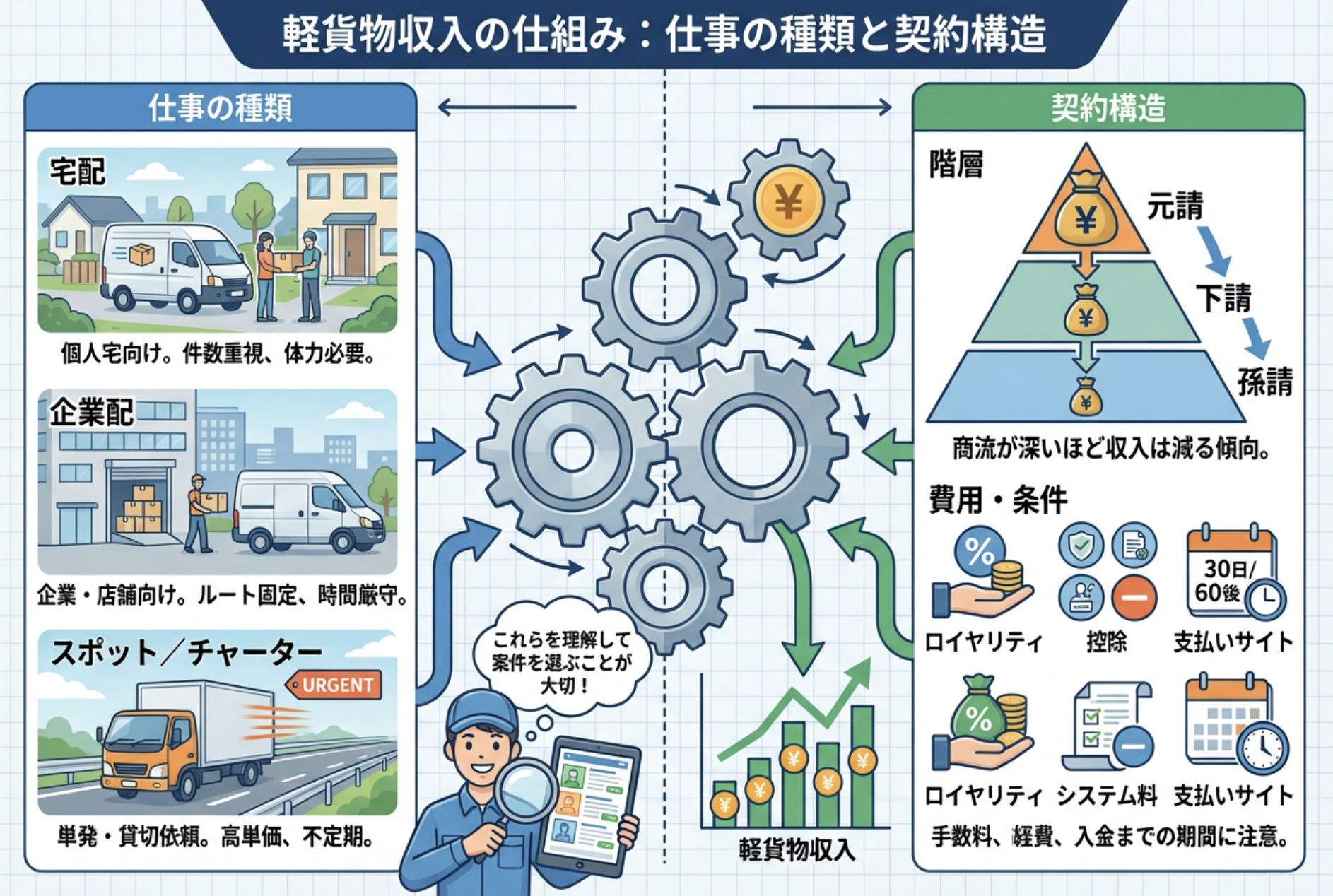 軽貨物の収入は「仕事の種類」と「契約構造」によって大きく左右されます。仕事の種類には宅配・企業配・スポット/チャーターなどがあり、契約構造には元請から下請・孫請へと続く階層やロイヤリティ、控除、支払いサイトなどがあります。これらを理解した上で案件を選ぶことが大切です。