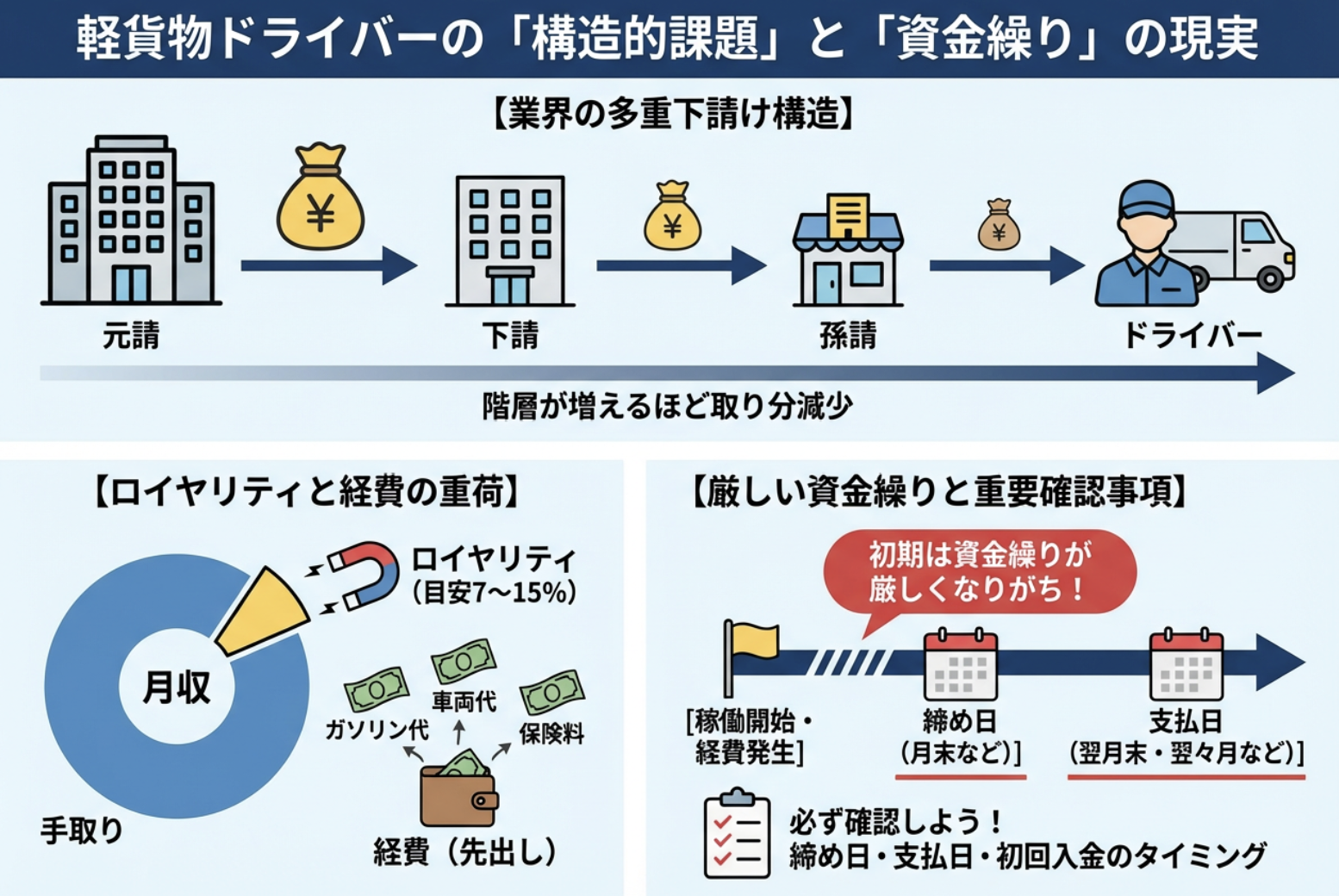 契約構造とロイヤリティ軽貨物業界では、元請から下請、孫請へと仕事が流れることがあり、階層が増えるほどドライバーの取り分は減少します。また、多くの案件でロイヤリティが発生し、月収の7〜15%程度が目安と言われています。ロイヤリティの内訳やトラブル時のサポート内容が明確な業者を選びましょう。